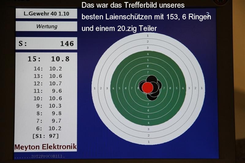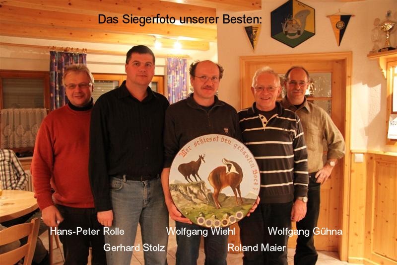 Erster mit 544 Punkten wurde Alfred Sieger und konnte sich über Schinken und Bier erfreuen. Zweiter mit 384 Punkten wurde Wolfgang Quanz vor Alfred Hirt, der 380 Punkte erreichte.